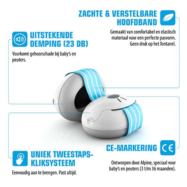 • Beschermt baby’s en peuters tegen schadelijk geluid en harde muziek