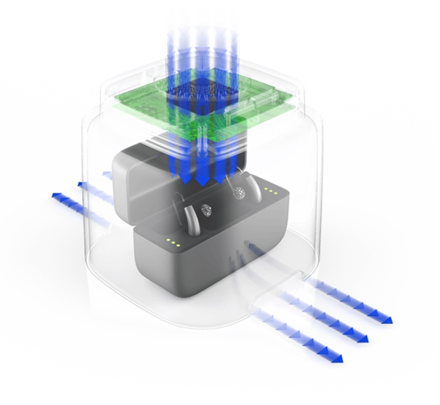 This Dry-cap is suitable for all rechargeable hearing aids, but also for Airpods. The hearing aids are electrically cleaned, disinfected and dried while charging. The Dry-cap can easily be placed over the charger, this dry box has a slightly larger size, so that the larger charging stations also fit underneath.