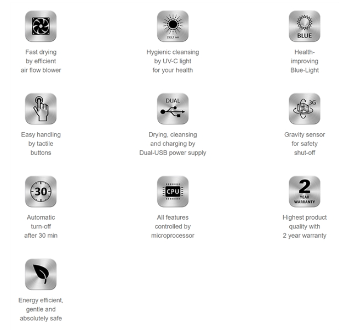 With the Dry&Clean mode of 2 hours, the devices are dried and hygienically cleaned by an efficient fan and a UV-C lamp. When using only the Clean mode, the hearing aids are hygienically cleaned in 2 minutes. At the end of the process, the drying box switches off automatically.