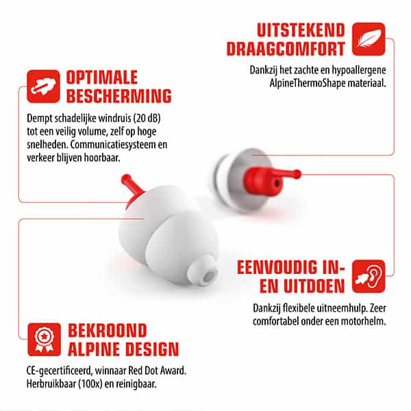 Alpine has developed the very comfortable MotoSafe earplugs especially for motorcyclists that fit under any helmet. The package contains two different sets of earplugs, for heavy and medium attenuation. Suitable for dirt bikes, long tours and high speeds. Other road traffic, a navigation system and of course the engine itself remain sufficiently audible.