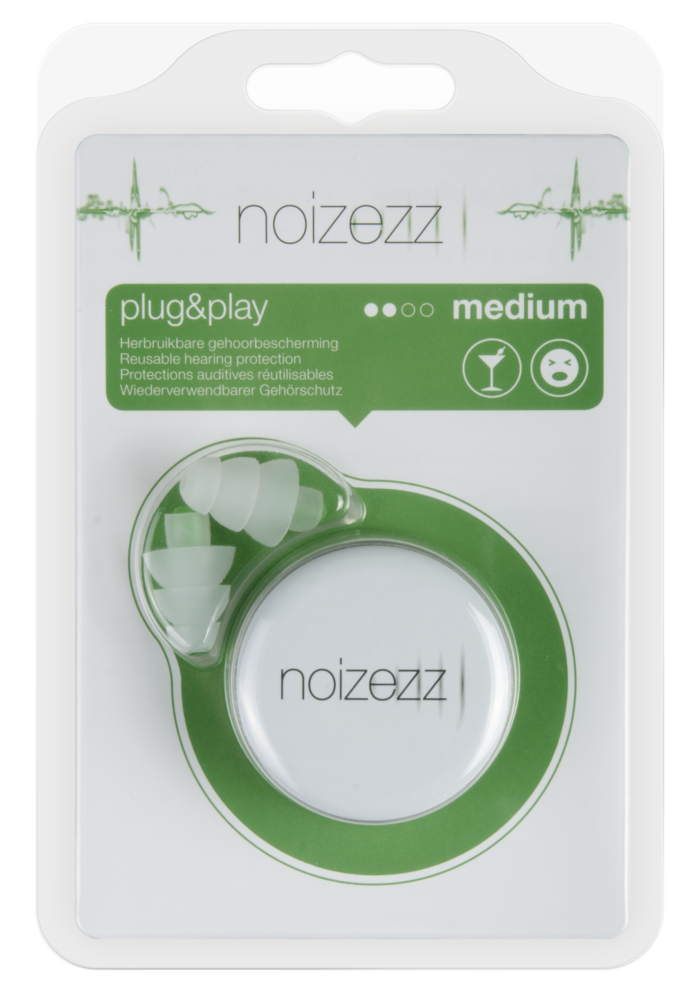 The Plug & Play earplugs from Noizezz are earplugs with filters that you can wear immediately. They fit in any ear and can also be reused. Easy if you start wearing them more often.