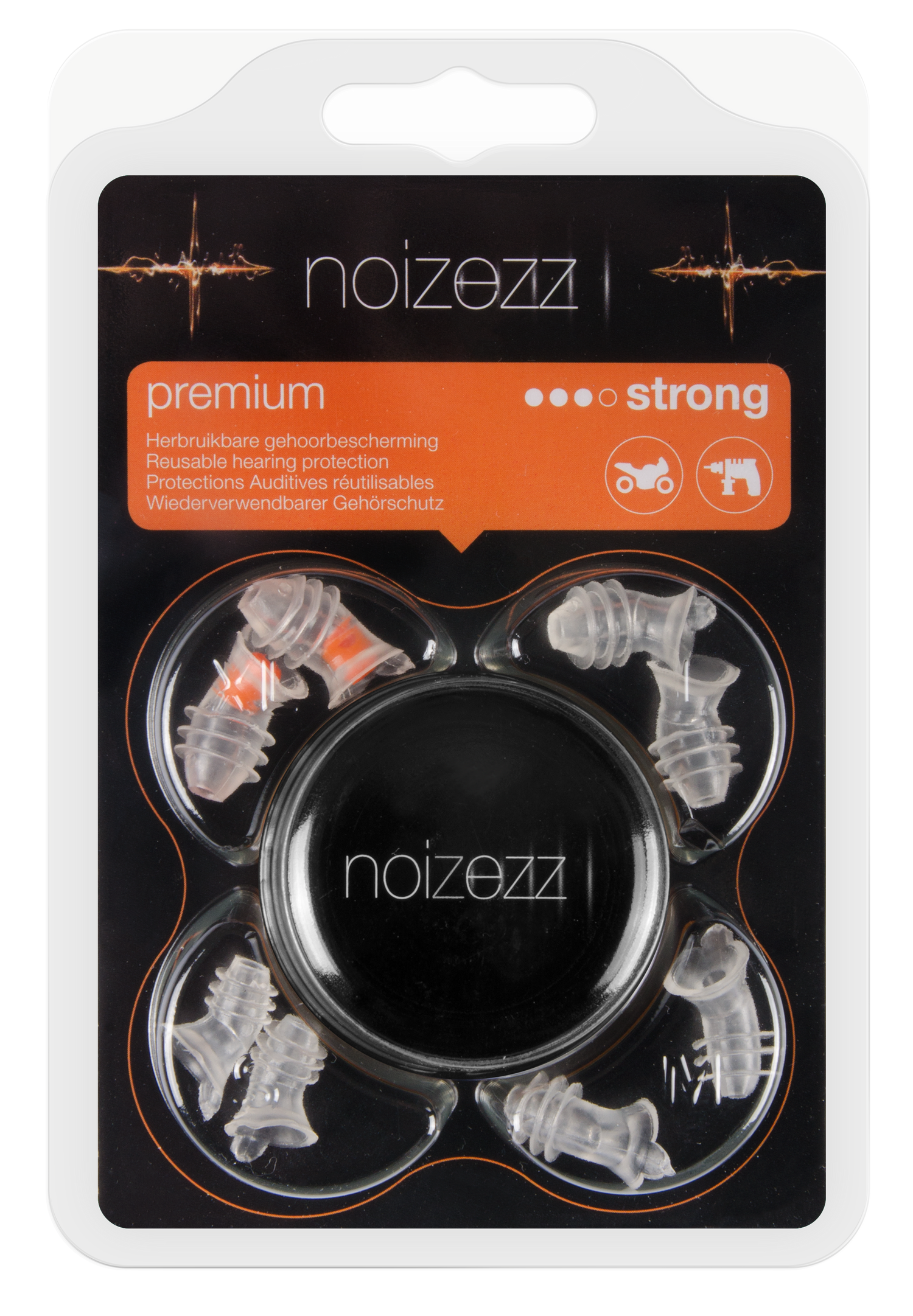 The Noizezz Orange Strong hearing protection has a powerful filter with an attenuation of up to 30 dB. This Noizezz hearing protection can be used to protect the ears against, among other things, wind noise when riding a motorcycle and working with electrical tools in the home and garden. The unique filter ensures that the necessary sounds are still heard. The Noizezz motorcycle earplugs are very comfortable due to the perfect fit. When purchasing, you will receive 4 standard sizes (S, M, L and XL) in the package. This means there is always a size that suits you.