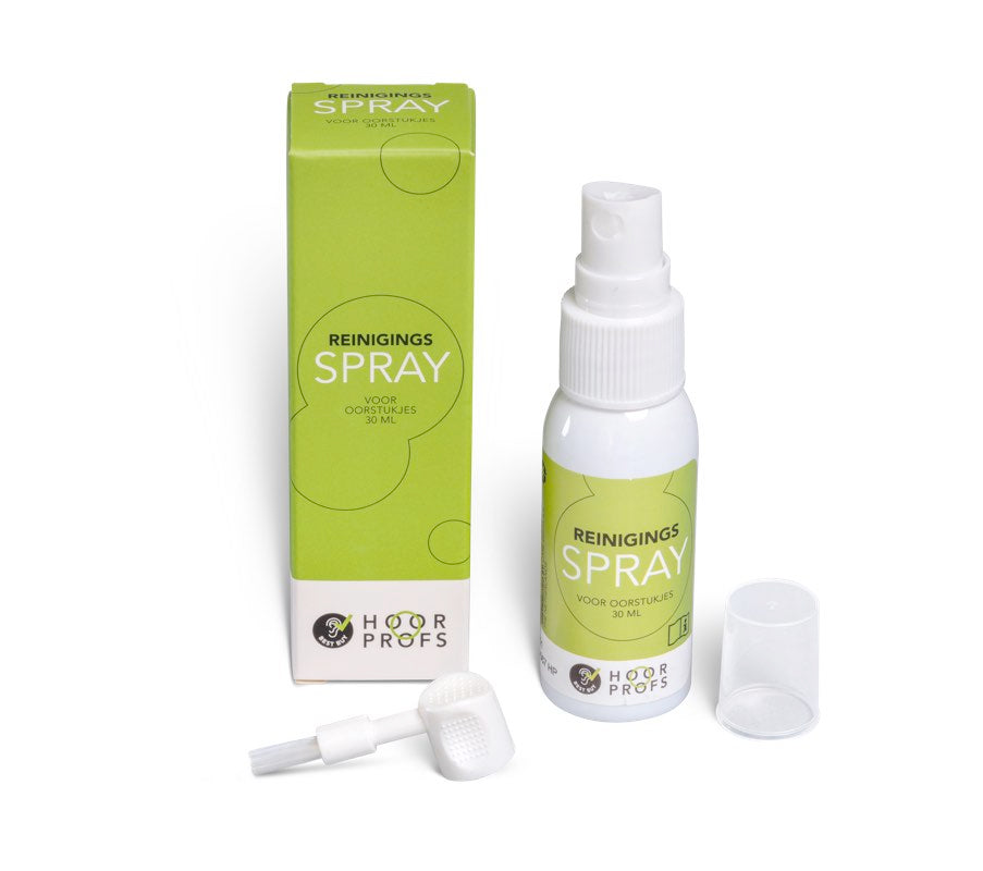Om uw hoortoestel te reinigen met onze reinigingsspray voor hoortoestellen, neemt u allereerst een reinigingsdoekje , hiermee wrijft u het hoortoestel schoon. Vervolgens zet u het borsteltje op de reinigingsspray en spuit u lichtjes met de spray zodat het borsteltje nat wordt. Hierna reinigt u het hoortoestel, het buisje en de luidspreker met het borsteltje. Met het haakje van het borsteltje kunt u oorsmeer uit het dopje verwijderen. Laat na afloop van het reinigen uw hoortoestellen even drogen, waarna u ze weer meteen kunt dragen.